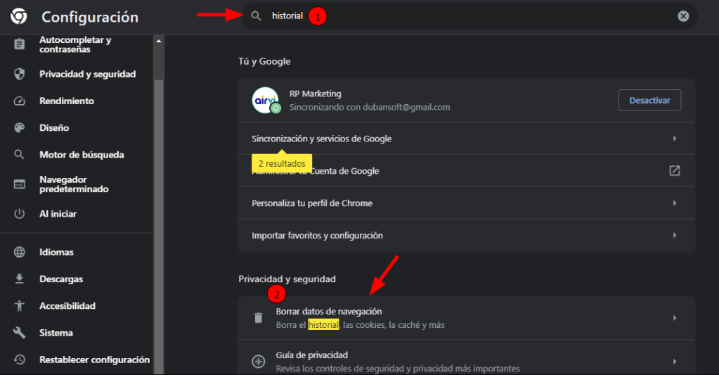 Luego escribe ‘historial’ en la casilla de búsqueda y haz clic en la opción «Borrar datos de navegación»