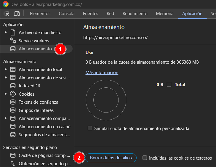 Selecciona la opción de «Storage» y después presiona el botón «Clear site data».