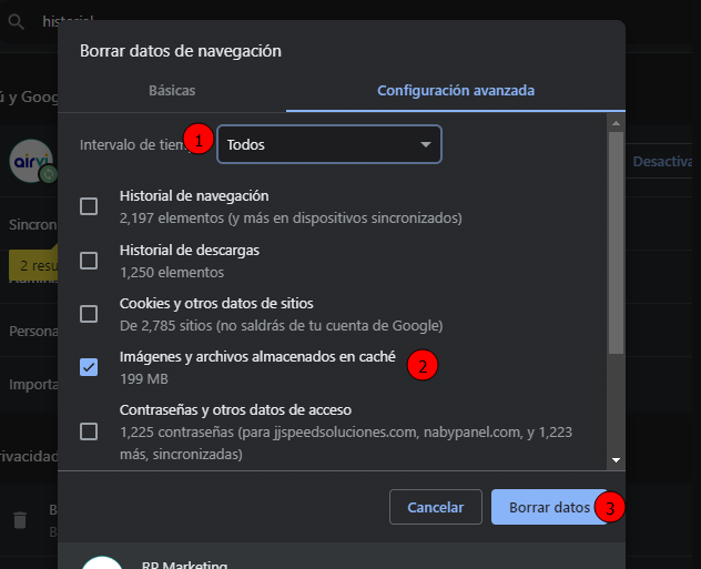 Importante Borrar la caché del navegador también cerrará las sesiones vigentes de sitios como WhatsApp web, facebook e instagram.