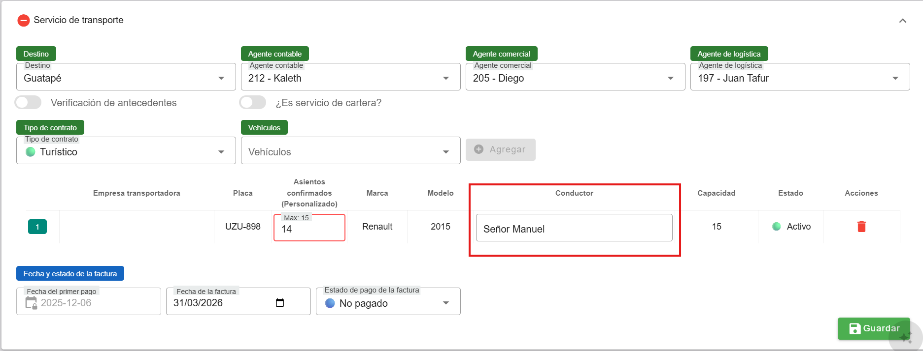 Se incorpora un campo para registrar el nombre del conductor dentro del m贸dulo de servicio de transporte al asignar veh铆culos en una reserva, permitiendo definir o modificar esta informaci贸n directamente en cada servicio sin afectar los datos base del veh铆culo. Adem谩s, se dispone de un bot贸n para ampliar la informaci贸n que dirige a una documentaci贸n m谩s completa con el detalle del funcionamiento y la configuraci贸n del servicio.