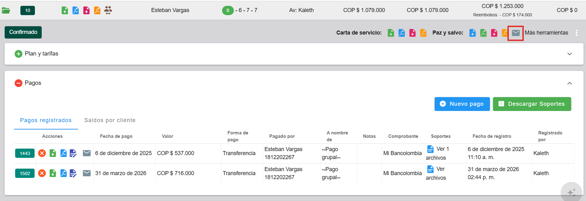 Se incorpora un nuevo bot贸n dentro del comprobante de reserva que permite enviar el documento de paz y salvo directamente al correo electr贸nico registrado del cliente titular. Esta funcionalidad facilita el proceso de comunicaci贸n con el cliente, agiliza la entrega del documento y garantiza que la informaci贸n llegue de forma inmediata y organizada, sin necesidad de descargas manuales o env铆os externos.