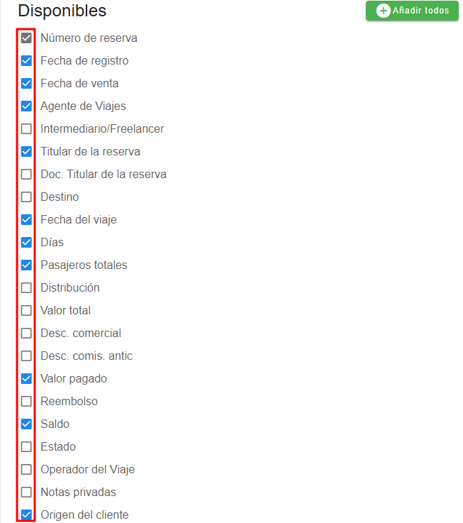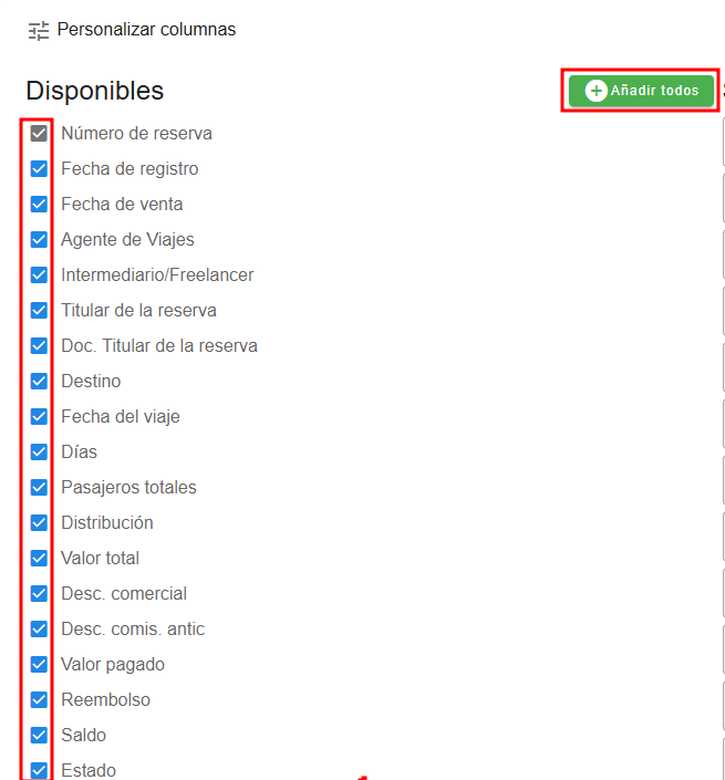 - Una vez entremos podremos seleccionar todas las columnas dando clic en el botón verde que dice Añadir todas, también podemos desmarcar todas las columnas presionando el botón que dice Retirar todas.