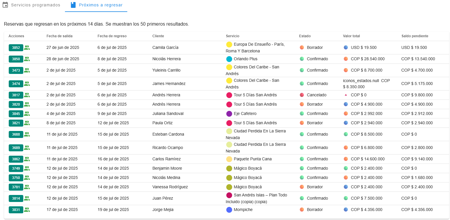 Ahora puedes consultar una lista de reservas cuyos viajes est谩n pr贸ximos a finalizar, con un margen de 14 d铆as a partir de la fecha actual. Esta herramienta permite al equipo anticiparse a tareas de cierre, seguimientos, postviaje y procesos administrativos, mejorando la planificaci贸n operativa y el servicio al cliente.