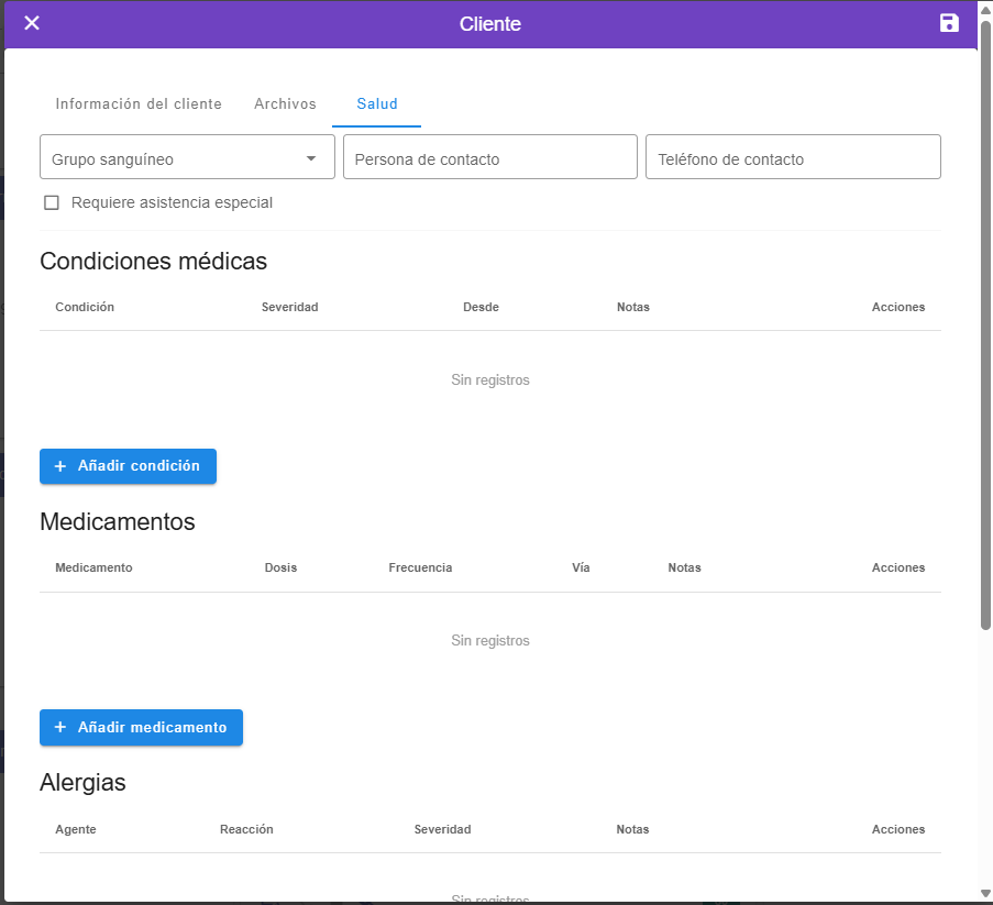 La funcionalidad Salud del Cliente permite registrar y gestionar de forma centralizada la información médica relevante del cliente desde la pestaña Salud, ubicada en Clientes → Editar cliente. Este apartado consolida datos generales de salud, condiciones médicas, medicamentos, alergias y contactos de emergencia, incorporando alertas visuales que evitan la pérdida de información y garantizan un registro completo, organizado y confiable para mejorar la atención, la prevención de riesgos y la calidad del servicio.