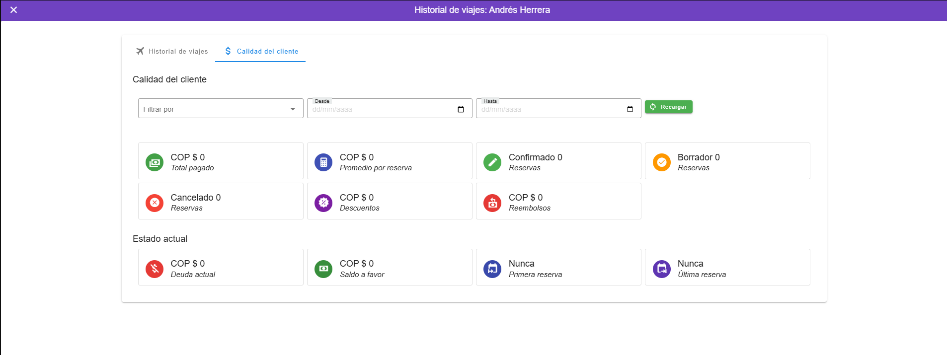 La pestaña Calidad del Cliente ofrece una vista consolidada del comportamiento financiero y operativo de cada cliente. Desde un solo lugar, es posible analizar su historial de reservas, pagos, descuentos, reembolsos y estado actual, utilizando filtros por fechas de viaje o cierre de venta. Esta información permite evaluar rápidamente la relación del cliente con la empresa y facilita la toma de decisiones comerciales y operativas.