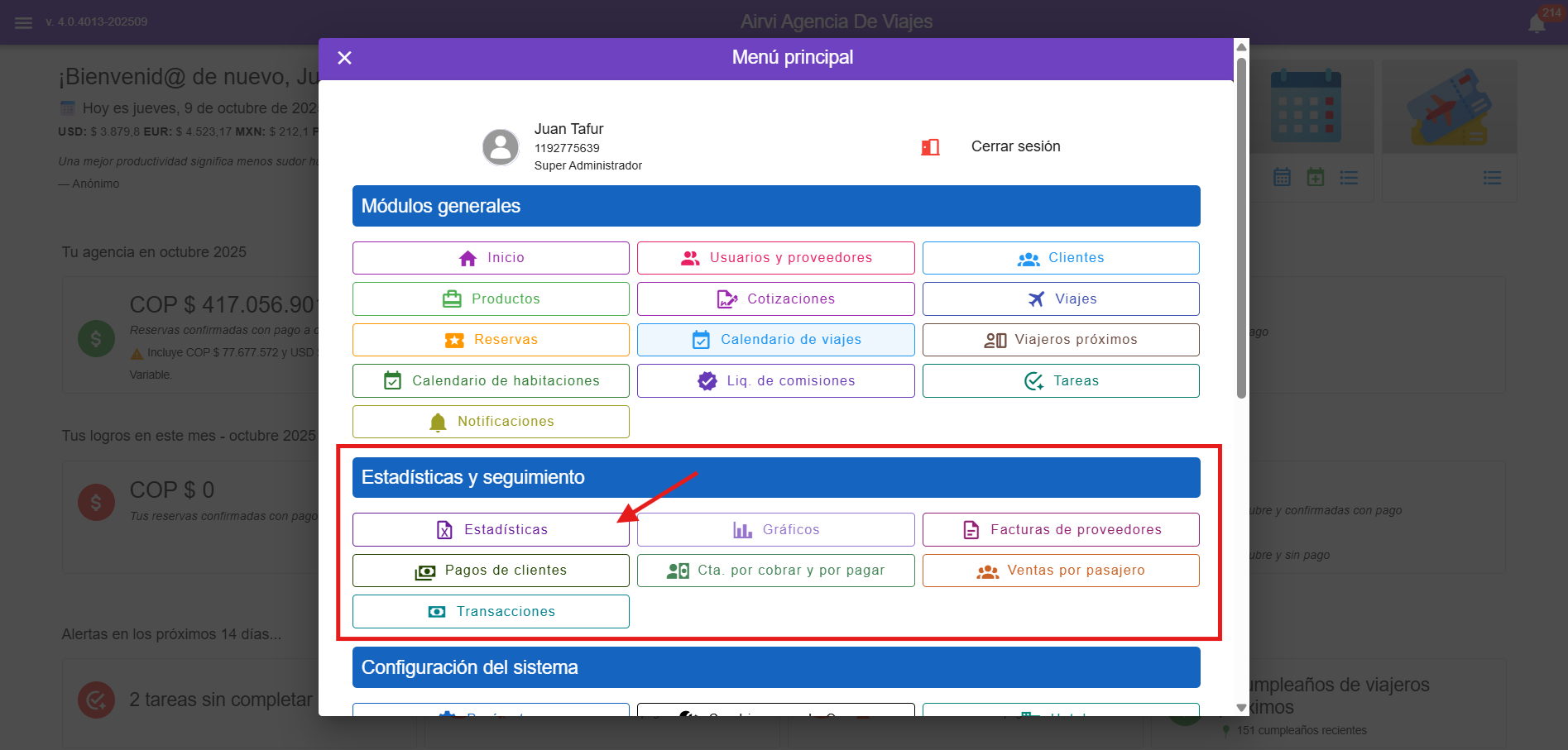 Para ingresar al módulo de Estadísticas, haz clic en el menú principal y luego selecciona la opción Estadísticas.
