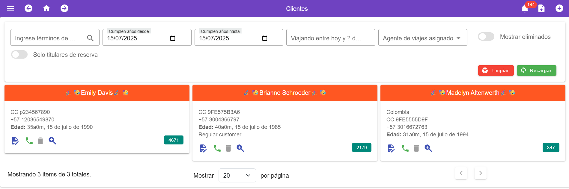 El sistema ahora muestra una nueva alerta en la página principal relacionada con los cumpleaños recientes de los viajeros. Cuando el cliente esté cumpliendo años, se mostrará el cuadro de registro de color naranja.