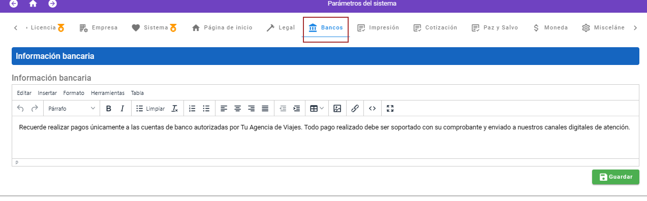 La parametrizaci贸n de "Bancos" implica configurar la informaci贸n bancaria relevante que los clientes necesitan conocer para realizar pagos de manera segura y efectiva. Aqu铆 est谩n algunos aspectos clave que se incluyen en esta parametrizaci贸n: