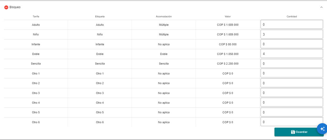 Bloqueo de cupos es el proceso de reservar un n煤mero determinado de espacios en una reserva para pasajeros seg煤n su tarifa y tipo de acomodaci贸n, sin especificar a煤n los nombres de dichos pasajeros. Es crucial actualizar el bloqueo a medida que los viajeros se vayan incorporando al viaje.