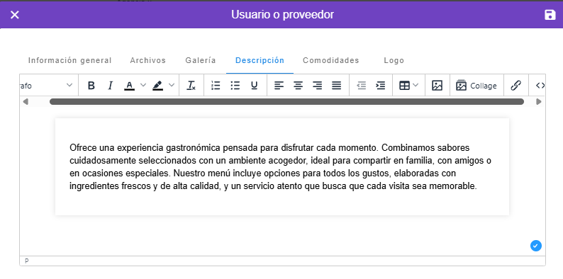 - Para agregar una descripción a un proveedor tipo hotel debes hacer clic en el botón azul para "Editar" un usuario o proveedor: