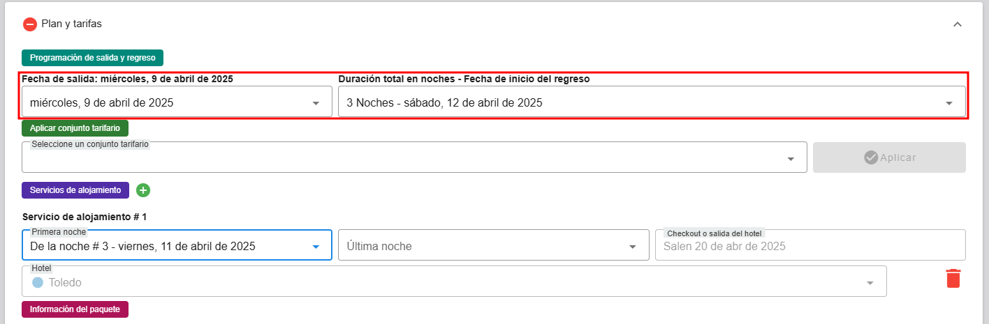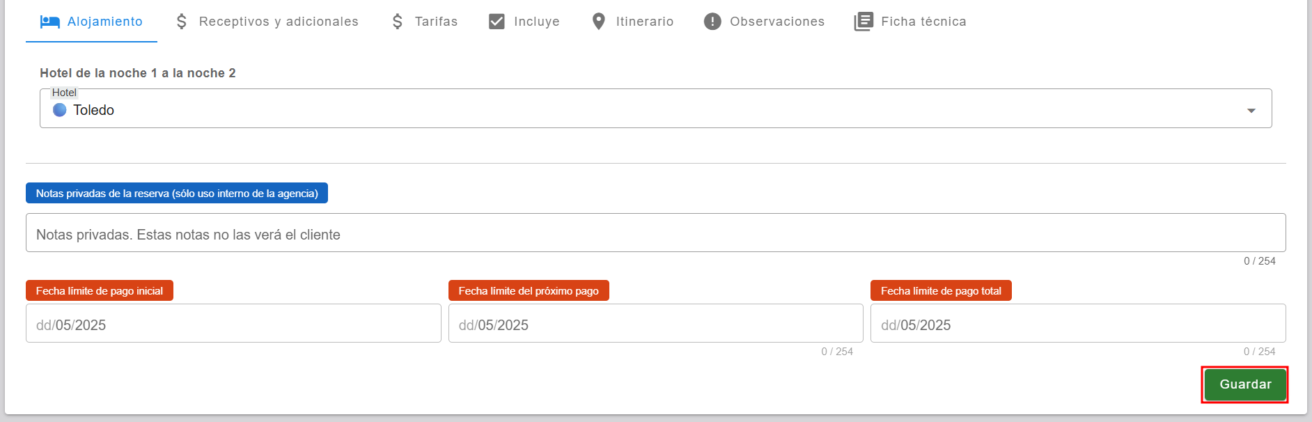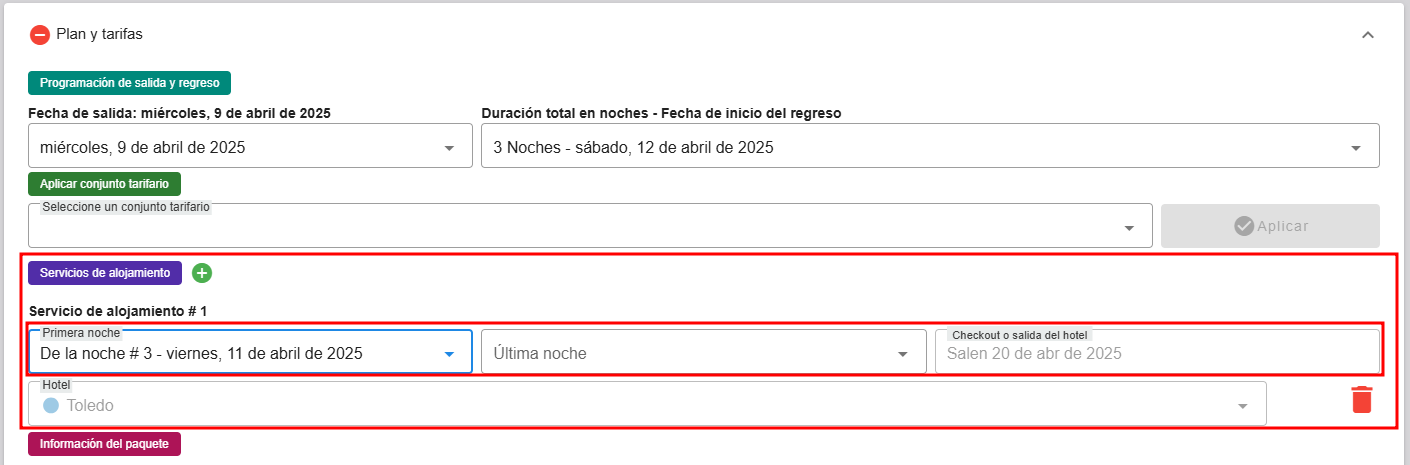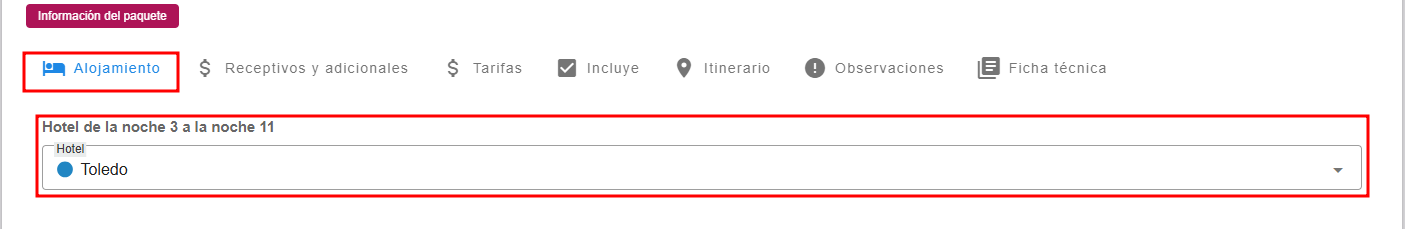 • En la sección de alojamiento, selecciona el hotel o los hoteles correspondientes. La configuración se aplicará de acuerdo con los periodos de alojamiento que hayas agregado.