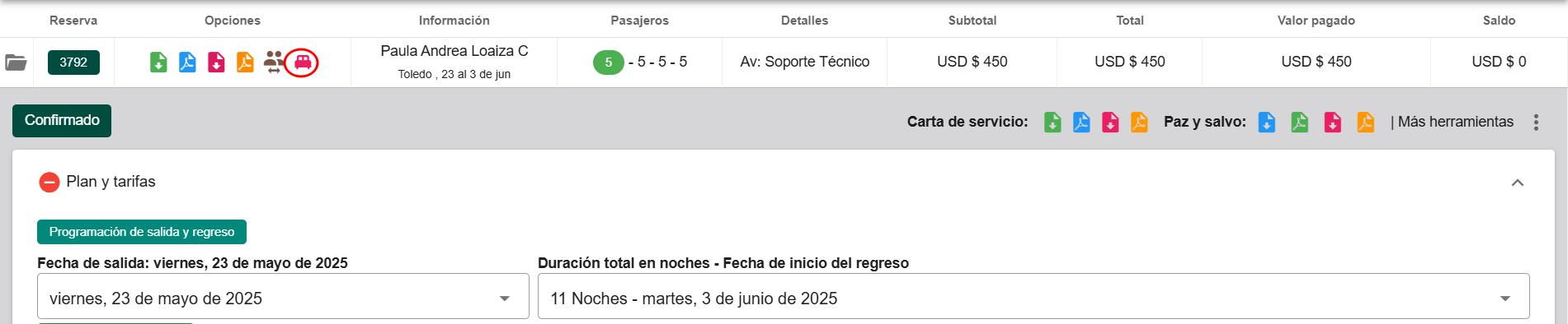Una vez configurado, los clientes, huéspedes o viajeros, junto con el titular de la reserva, aparecerán en la barra principal de cada reserva, donde se encuentra un ícono rojo en forma de cama.