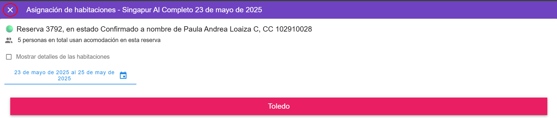 Nota: Si deseas obtener más detalles sobre la habitación, selecciona la opción correspondiente que se encuentra debajo del nombre del titular de la reserva.