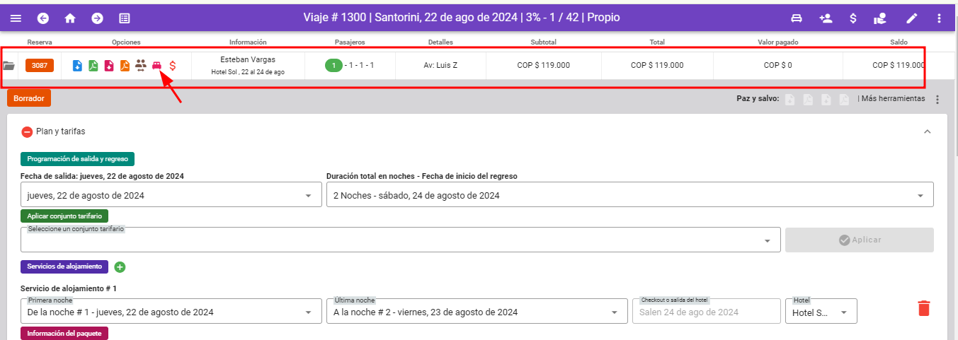 Una vez configurado, los clientes, hu茅spedes o viajeros, junto con el titular de la reserva, aparecer谩n en la barra principal de cada reserva, donde se encuentra un 铆cono rojo en forma de cama.