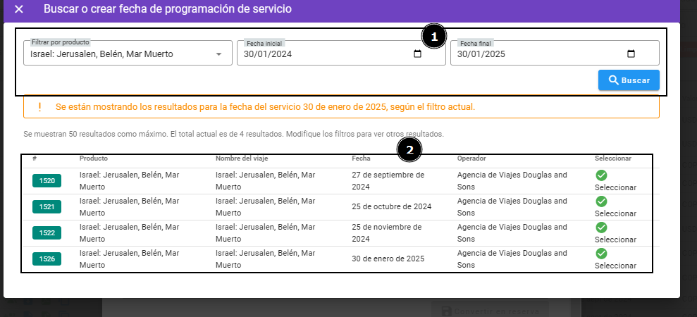 Nota: Si seleccionas una programación existente, asegúrate de verificar bien la fecha en la que se establecerá la nueva reserva para evitar errores.