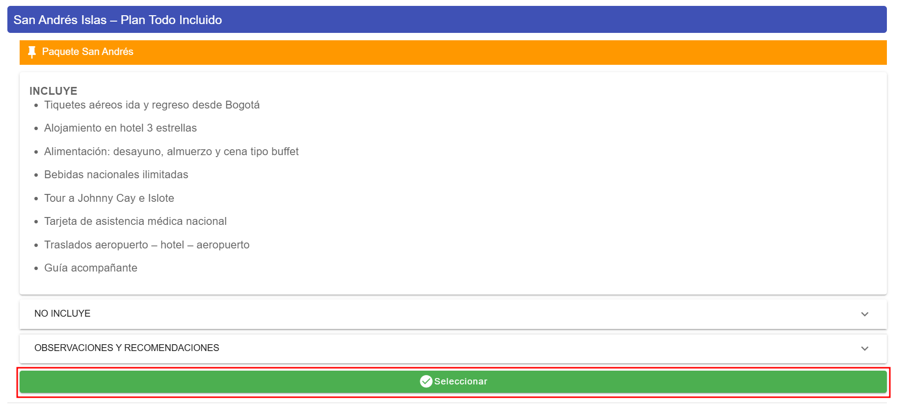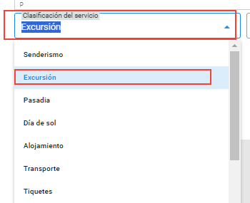 - Selecciona la categoría que mejor describa el producto o servicio. Las opciones incluyen: Senderismo, Excursión, Pasadía, Día de Sol, Alojamiento, Transporte, Tiquetes, Asistencia Médica (nacional o internacional), Paquete Turístico.