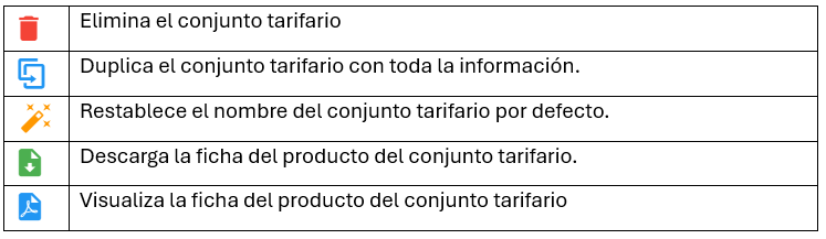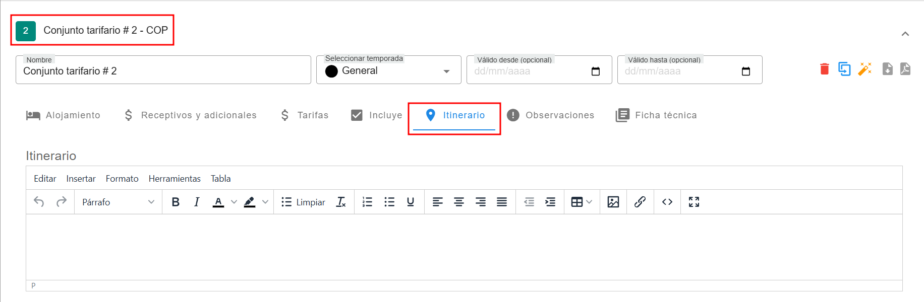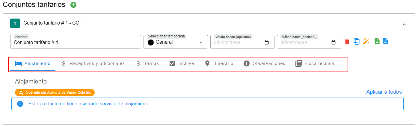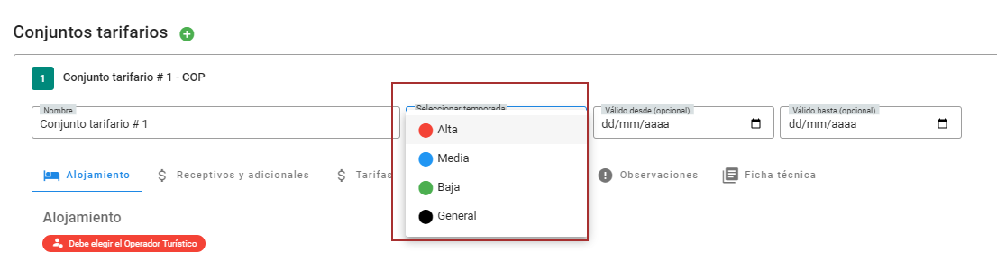 - El Conjunto Tarifario permite gestionar las tarifas asociadas a diferentes temporadas y condiciones de disponibilidad.