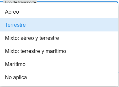 - Elige el tipo de transporte utilizado: Aéreo, Terrestre, Mixto (Aéreo y Terrestre), Mixto (Terrestre y Marino), o "No Aplica".