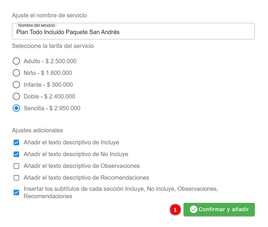 - Importando información de otro producto: Usa la lupa para buscar un producto existente, selecciona el deseado, especifica la información a extraer (precios, incluye, no incluye, observaciones y recomendaciones) y confirma para añadirlo.