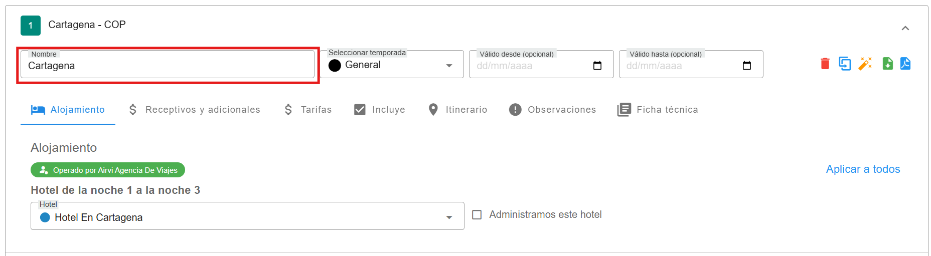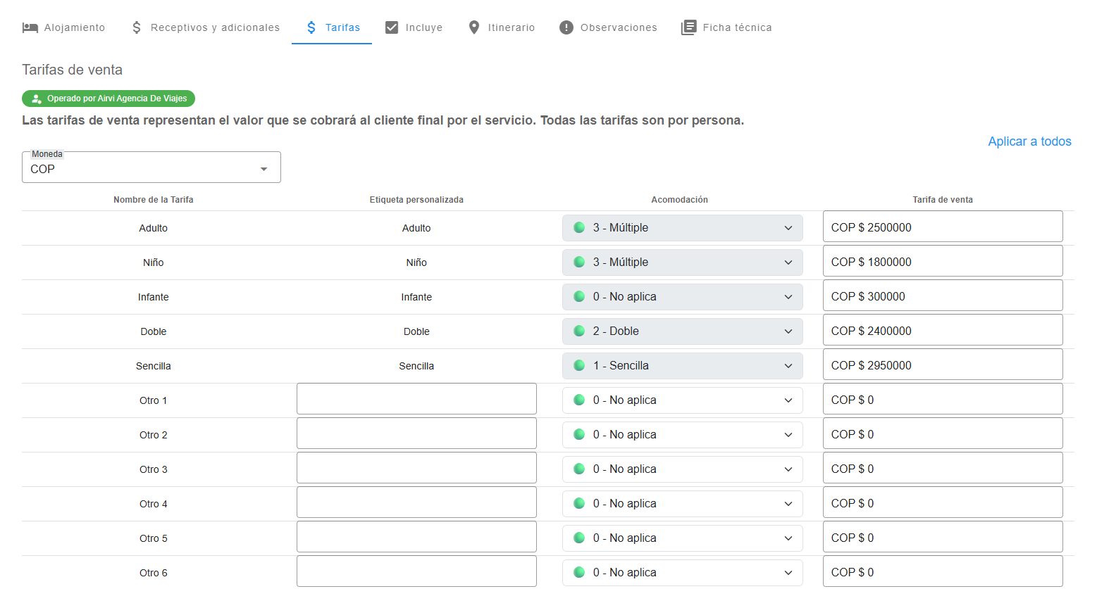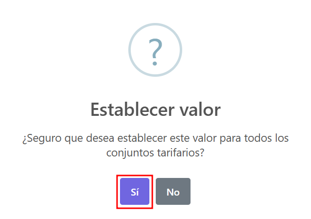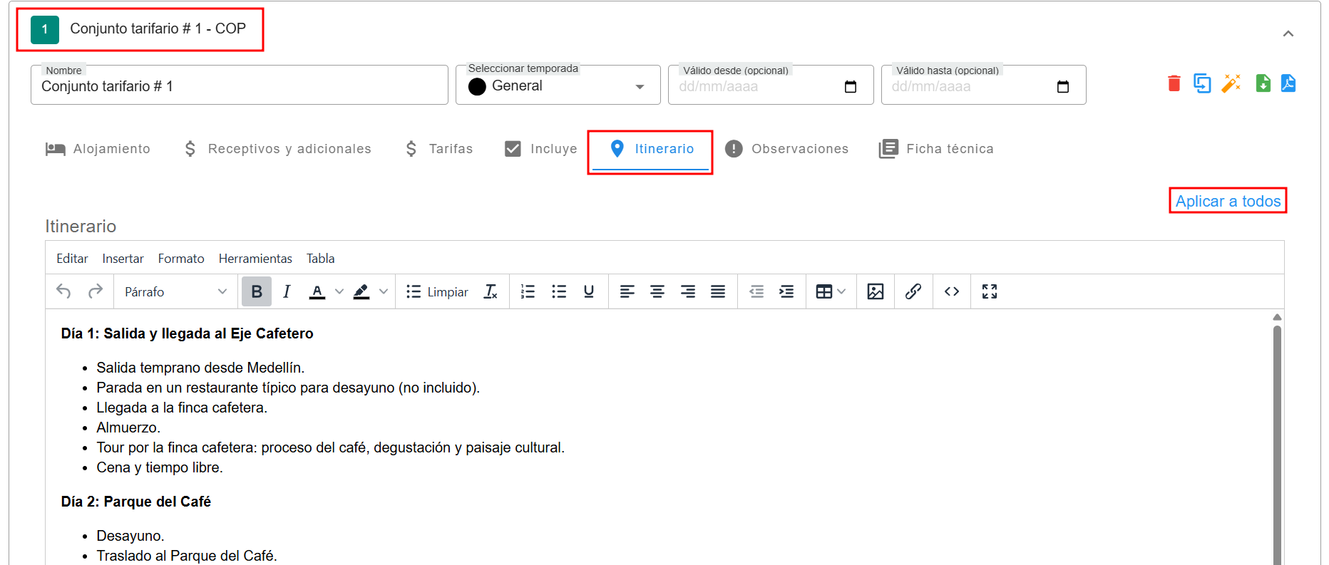Esta opción permite replicar la información configurada en un conjunto tarifario hacia los demás conjuntos registrados, según la sección en la que te encuentres. Por ejemplo, si has definido un itinerario en el primer conjunto tarifario y presionas "Aplicar a todos", el sistema copiará ese itinerario a los demás conjuntos automáticamente. Lo mismo ocurre con cualquier otra sección donde utilices esta función, lo que facilita una gestión más ágil y coherente de la información.