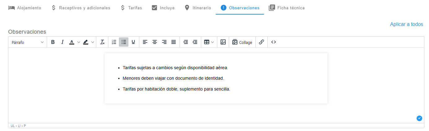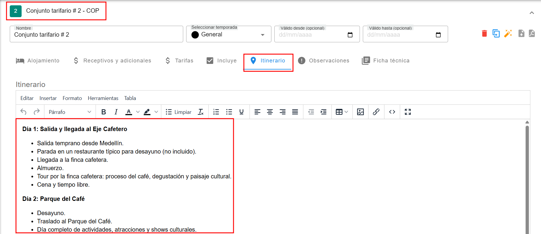 Cada ítem permite ingresar texto libre e incluir información como paradas, horarios estimados, actividades programadas, condiciones logísticas, observaciones clave o cualquier detalle relevante. También es posible agregar imágenes, íconos y logotipos para reforzar la presentación visual. Cuando el producto se utilice en una cotización o reserva, el itinerario cargado podrá ser editado para personalizarlo sin afectar la plantilla original del producto. Esto permite que la información base se mantenga estandarizada, mientras se adaptan los detalles a cada caso particular.