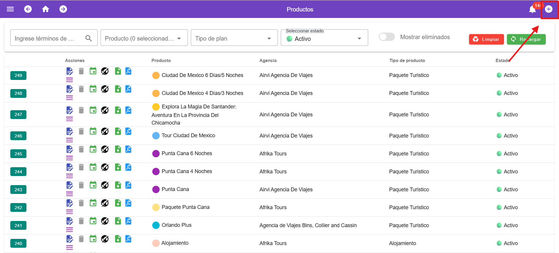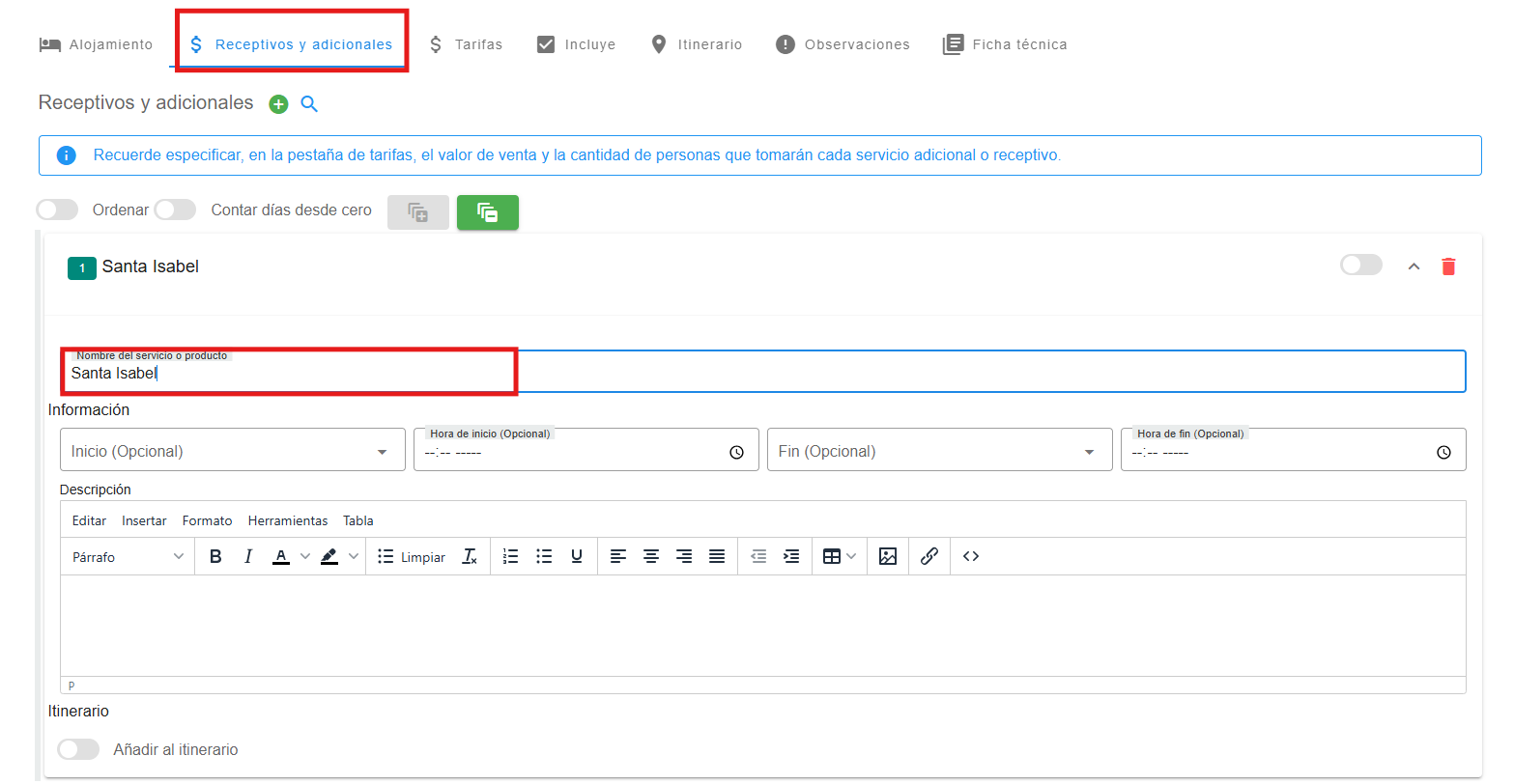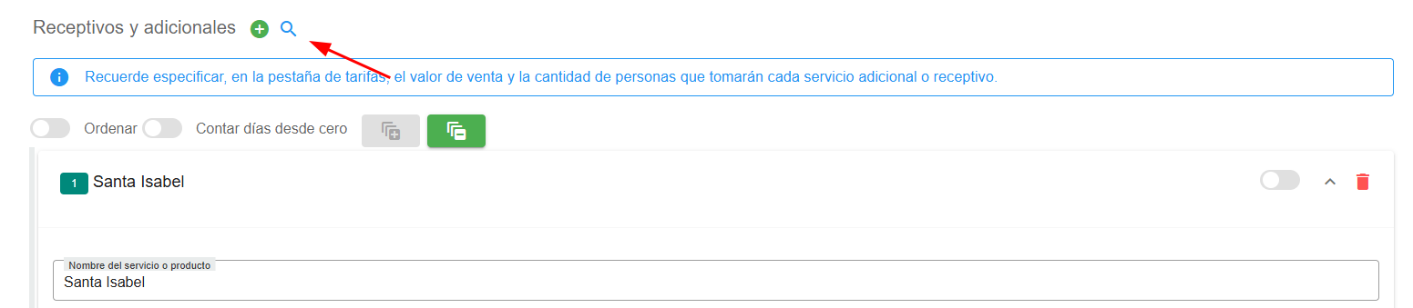 - Manualmente: Haz clic en el botón “+” para agregar un receptivo o adicional, asignándole un nombre y una descripción.