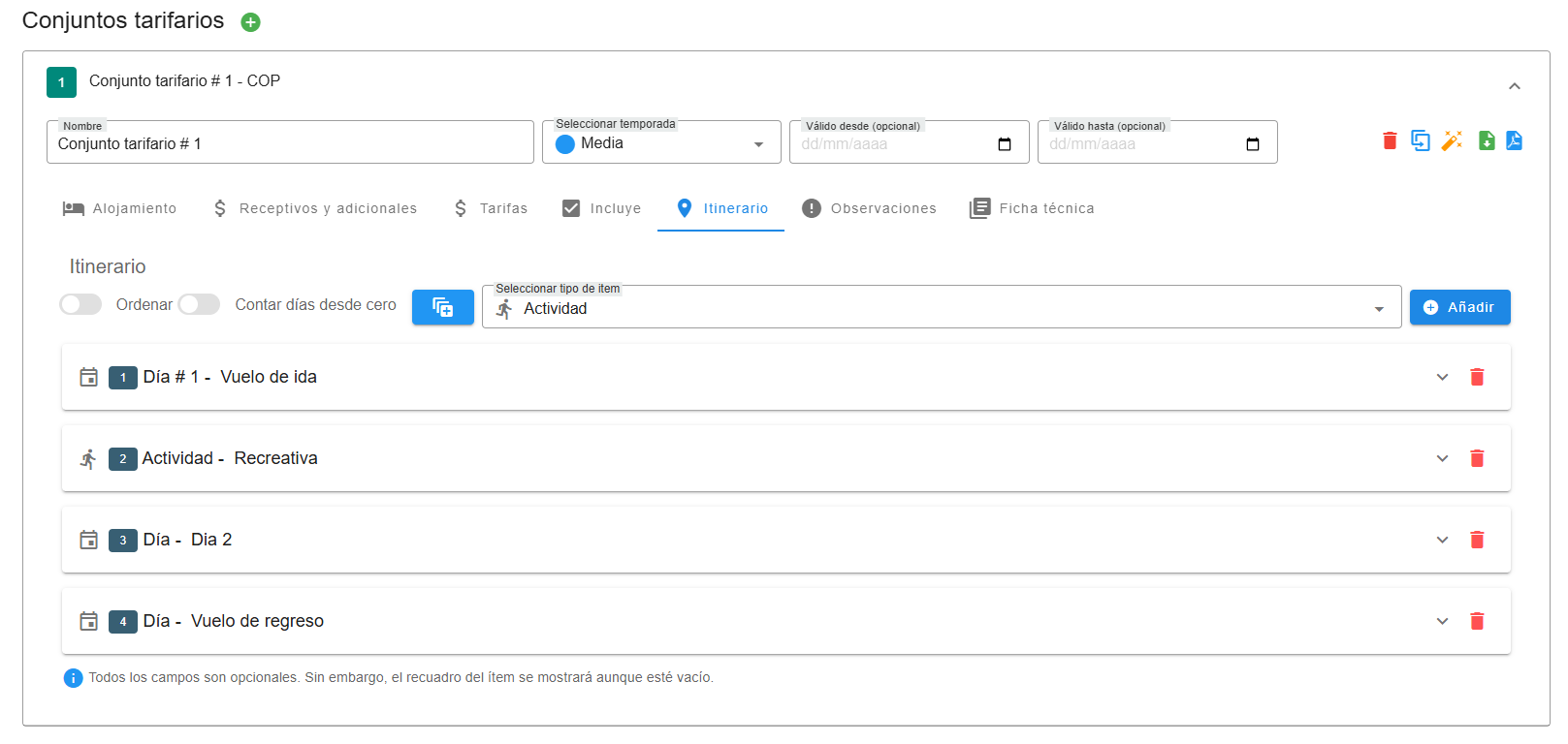 Al configurar el itinerario en el producto, podrás añadir ítems clasificados por tipo: