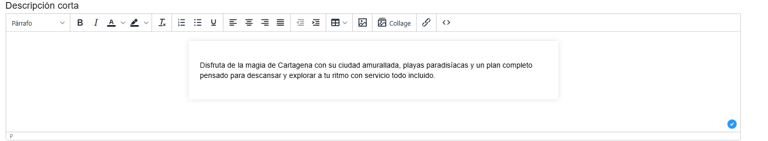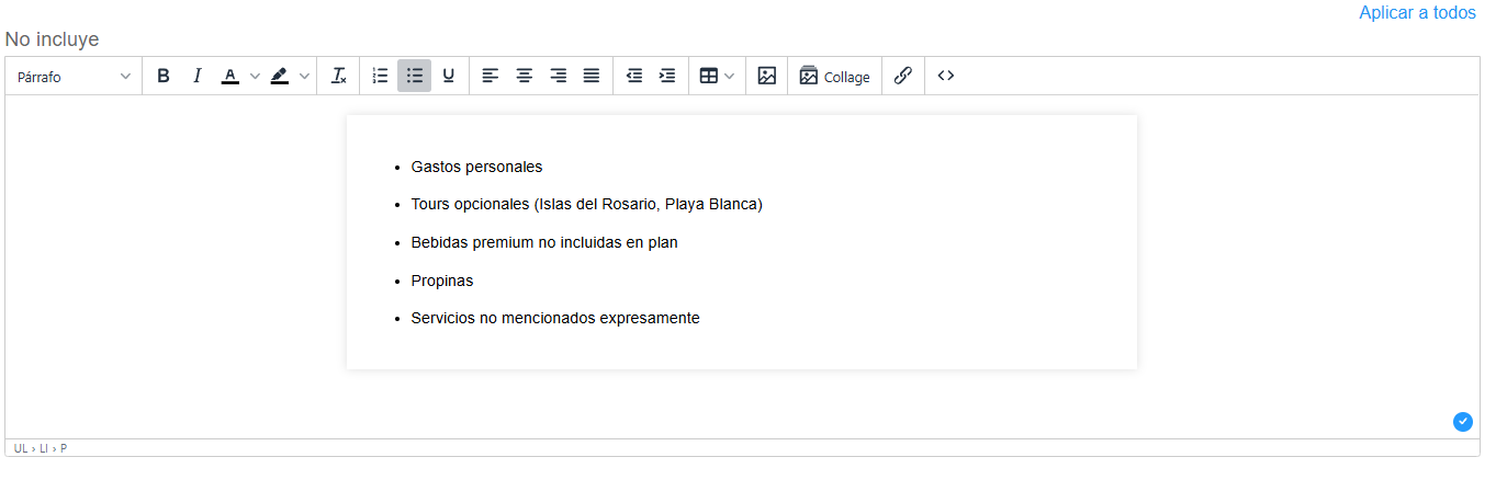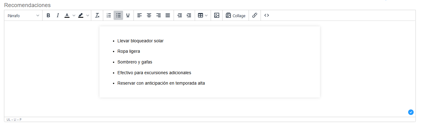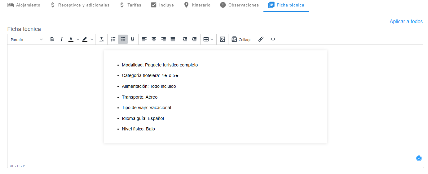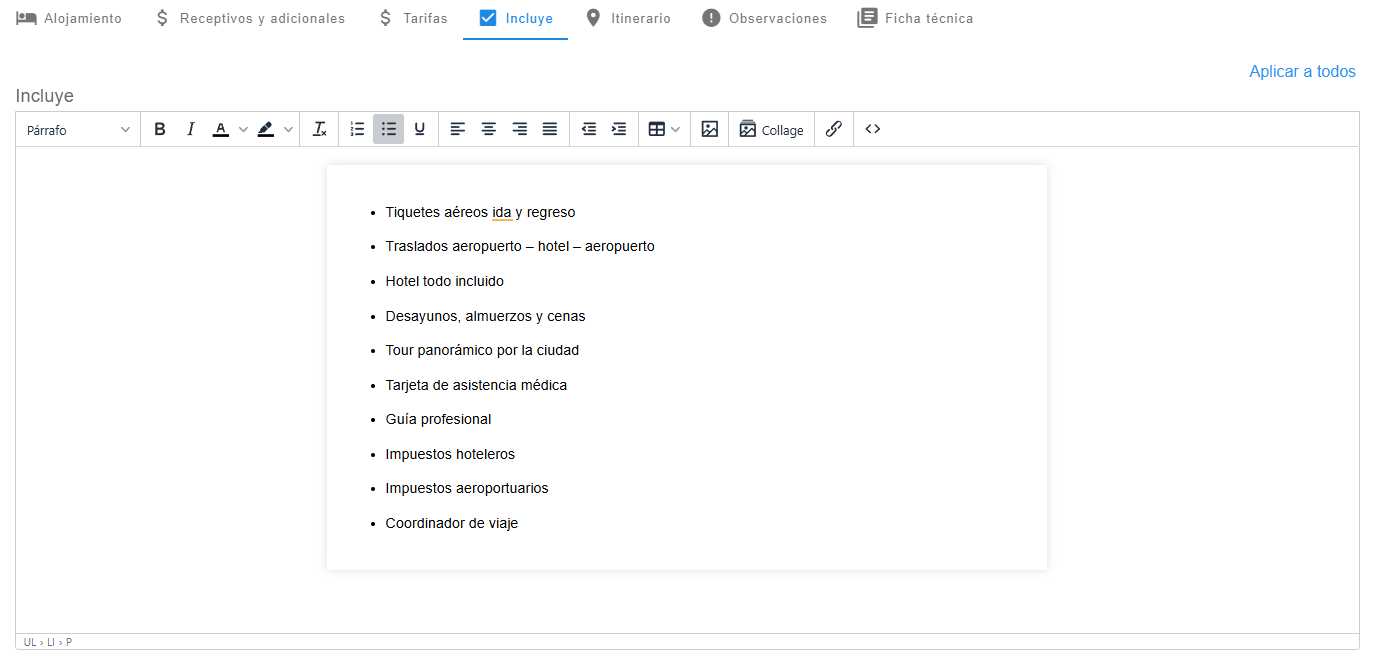 El campo Itinerario en la creación de un producto permite registrar el detalle completo del recorrido o prestación del servicio asociado. Esta información funcionará como plantilla base, de manera que, al utilizar el producto en una cotización o reserva, el itinerario se copie automáticamente y pueda ser modificado según las necesidades del cliente o del servicio específico.