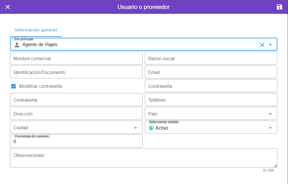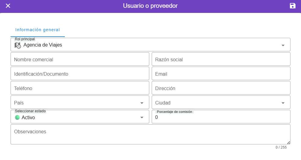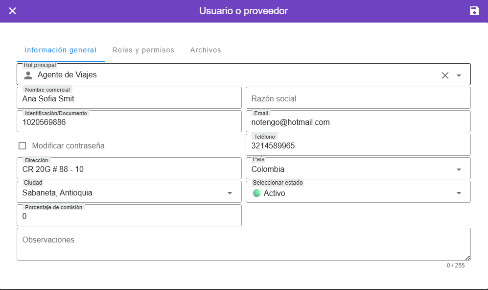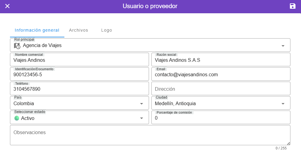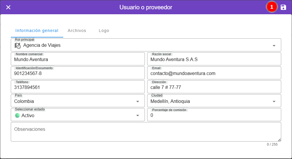 - Diligenciar la información requerida: Completar los datos necesarios según el rol asignado. En este caso, para la agencia de viajes, los campos obligatorios son el Nombre y el Teléfono.