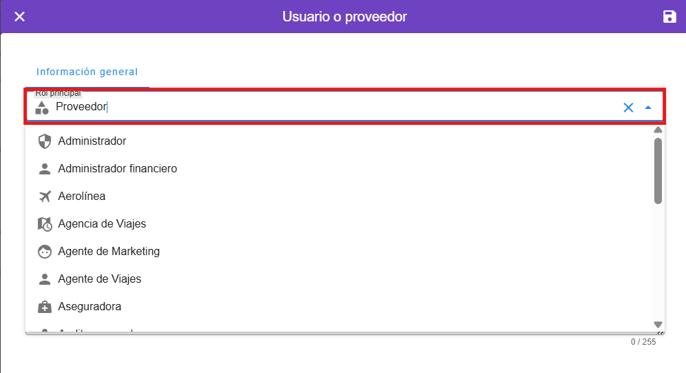 - Seleccionar el rol: Establece el rol Agencia de viajes