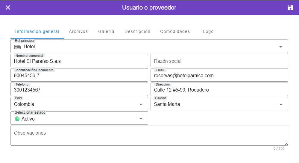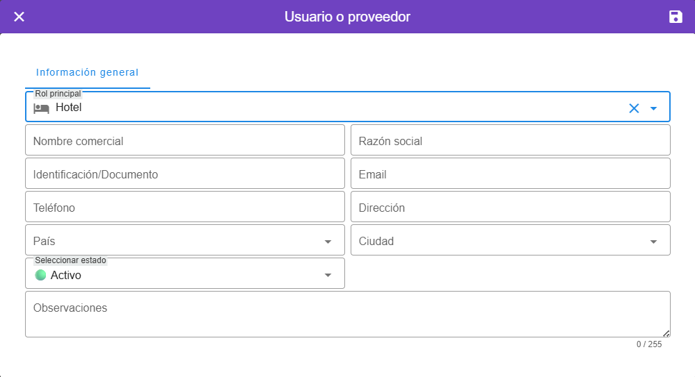 - Diligenciar la información requerida: Completar los datos necesarios según el rol asignado. En este caso, para el Hotel, los campos Obligatorios son el Nombre.