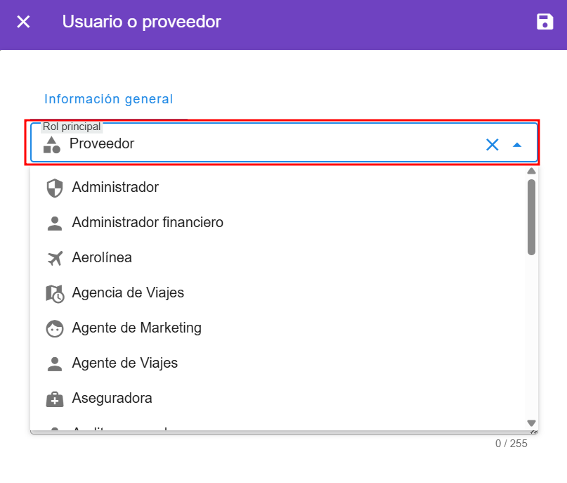 - Seleccionar el rol: Establece si el registro corresponde a un usuario o un proveedor.