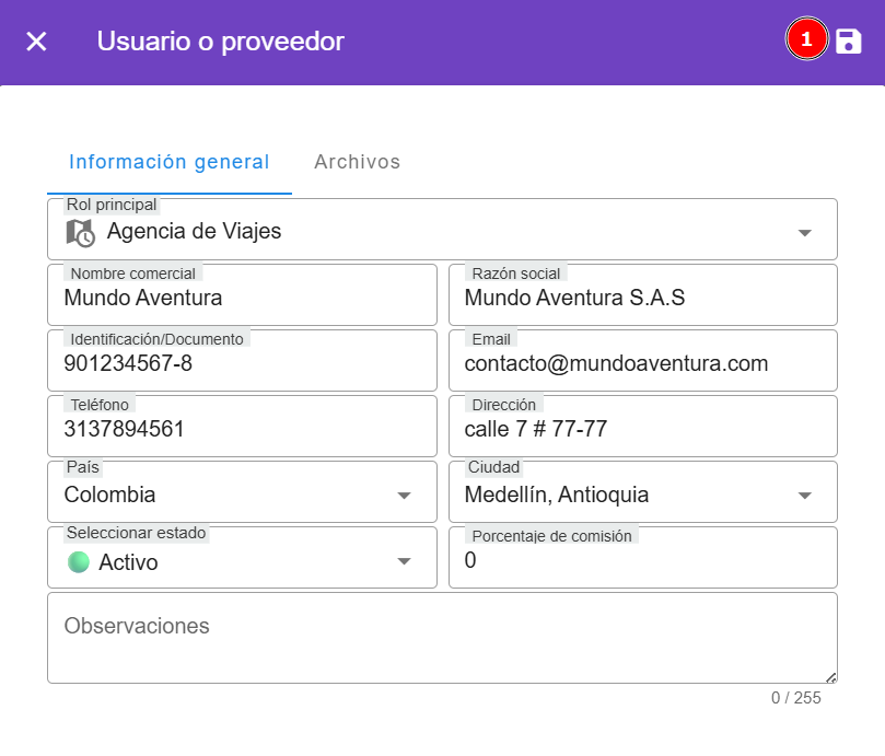 4. Diligenciar la información requerida: Completar los datos necesarios según el rol asignado. En este caso, para la agencia de viajes, los campos obligatorios son el Nombre y el Teléfono
