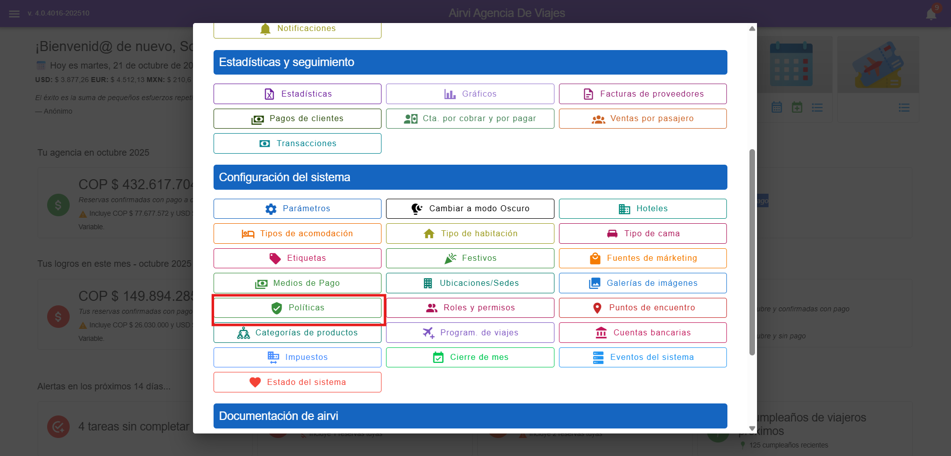 Para ingresar al módulo de Políticas, haz clic en el menú principal y luego selecciona la opción Políticas.