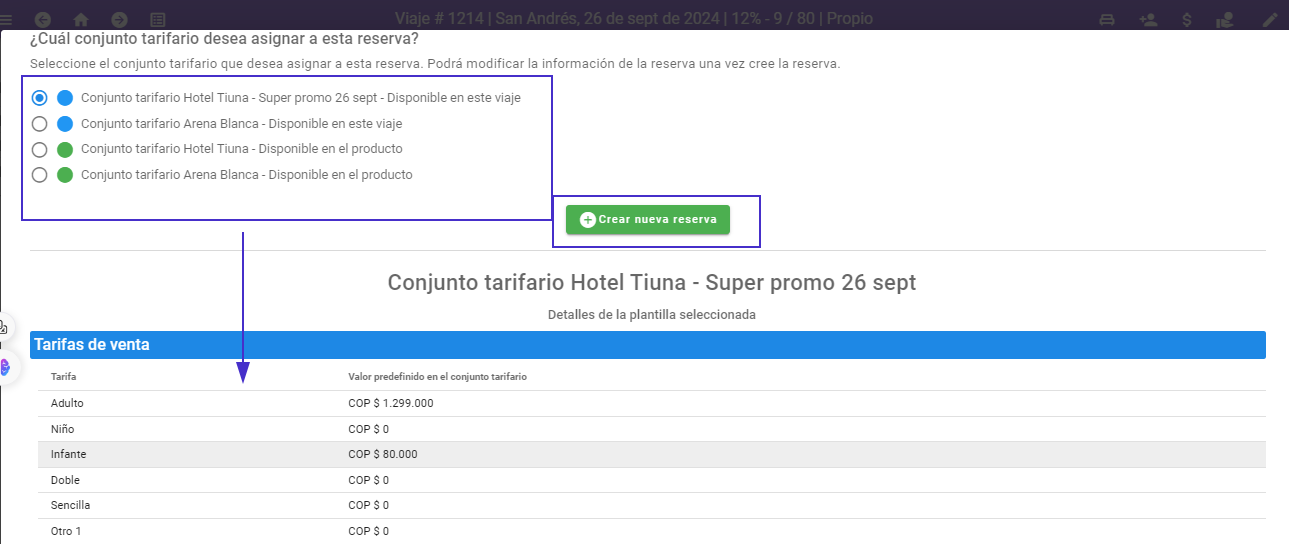 • Creación de la Reserva: Después de elegir el conjunto tarifario, haz clic en el botón verde que dice "Crear nueva reserva". La reserva se creará automáticamente en el sistema.