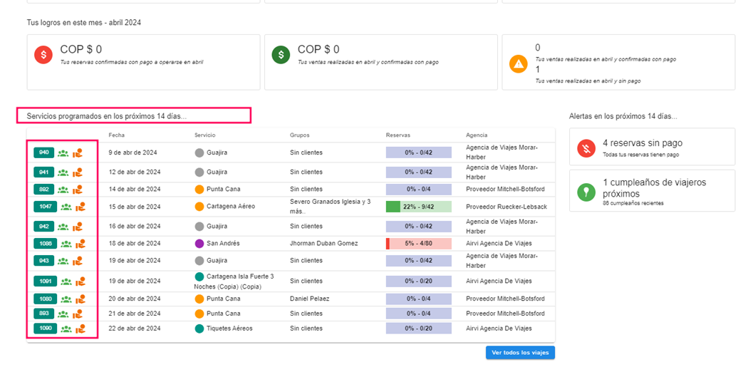 - En la página principal, se encuentra una sección que muestra todas las reservas programadas para los próximos 14 días.