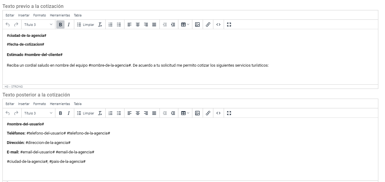 Permite personalizar los textos que acompa帽an las cotizaciones generadas, estableciendo tanto el dise帽o del texto previo como el posterior al cuerpo de la cotizaci贸n, adem谩s de incluir un texto de advertencia si es necesario.
