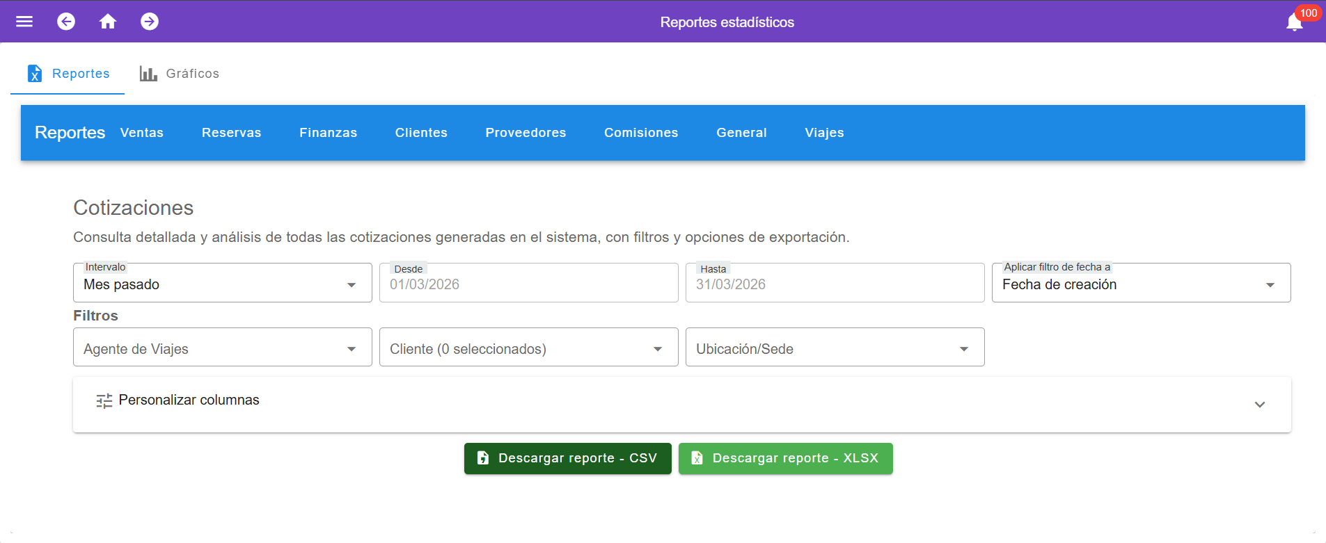 El reporte de Cotizaciones聽muestra el listado de cotizaciones generadas, incluyendo informaci贸n como t铆tulo, estado de entrega y conversi贸n, fechas de emisi贸n, vencimiento, salida y retorno, duraci贸n del viaje, cliente, agente de viajes, destino, ubicaci贸n o sede, origen del cliente y moneda. Tambi茅n presenta los valores econ贸micos asociados, como total antes de descuentos, porcentaje y valor de descuento, y el total a pagar por cliente, permitiendo consultar y analizar el comportamiento de las cotizaciones dentro de un periodo determinado.