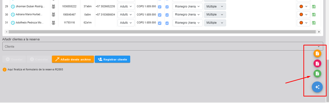 Para descargar el listado de pasajeros, simplemente pasa el puntero del rat贸n sobre el bot贸n de creaci贸n de grupos de viaje, que es un bot贸n azul con tres estrellas ubicado en la parte inferior derecha. Cuando lo hagas, se desplegar谩n tres opciones adicionales: una de color naranja, otra de color fucsia y otra de color verde. Para descargar la lista de pasajeros, simplemente haz clic en la opci贸n de color verde.