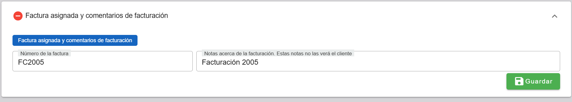Esta secci贸n permite registrar el n煤mero de factura asociado a la reserva y agregar comentarios internos relacionados con la facturaci贸n. La informaci贸n ingresada es utilizada como referencia administrativa y contable, permitiendo llevar control sobre la factura emitida y notas internas que no ser谩n visibles para el cliente.