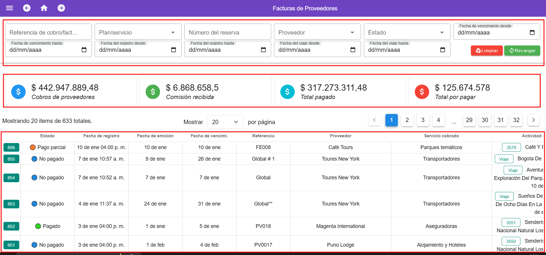- Lista de reservas y su estado:聽Muestra una lista detallada de las reservas asociadas a las facturas de proveedores, junto con su estado actual. Esto permite un seguimiento preciso del proceso de pago y la situaci贸n de cada reserva.