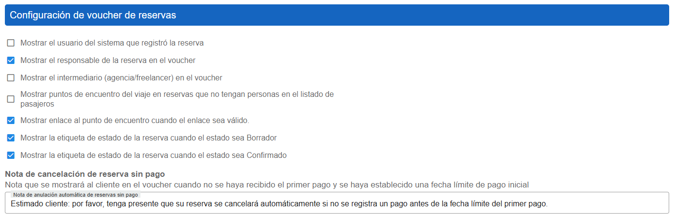Nota de cancelaci贸n de reserva sin pago: Se establece una nota est谩ndar que se incluir谩 en los vouchers de reservas que hayan sido canceladas sin pago, proporcionando una explicaci贸n clara y uniforme para los clientes.