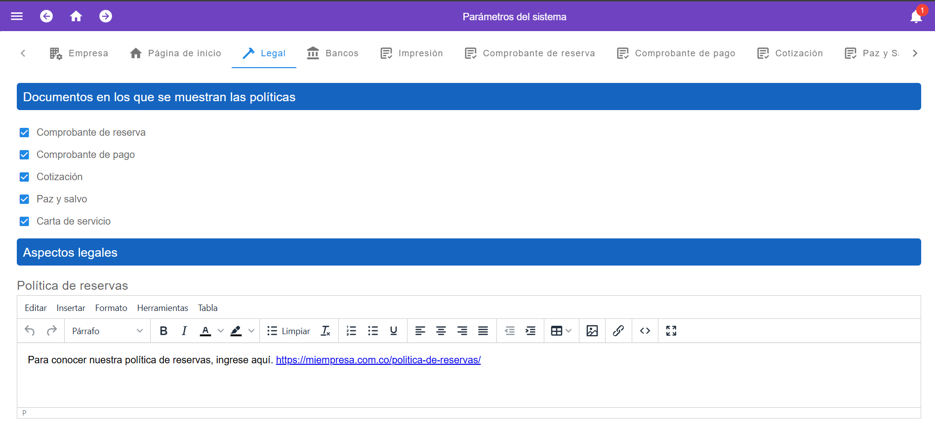 - Documentos en los que se muestran las políticas: Permite seleccionar en qué módulos se mostrarán las políticas mediante un checklist. Así, pueden elegir si desean que aparezcan en todos los módulos o solo en algunos específicos.