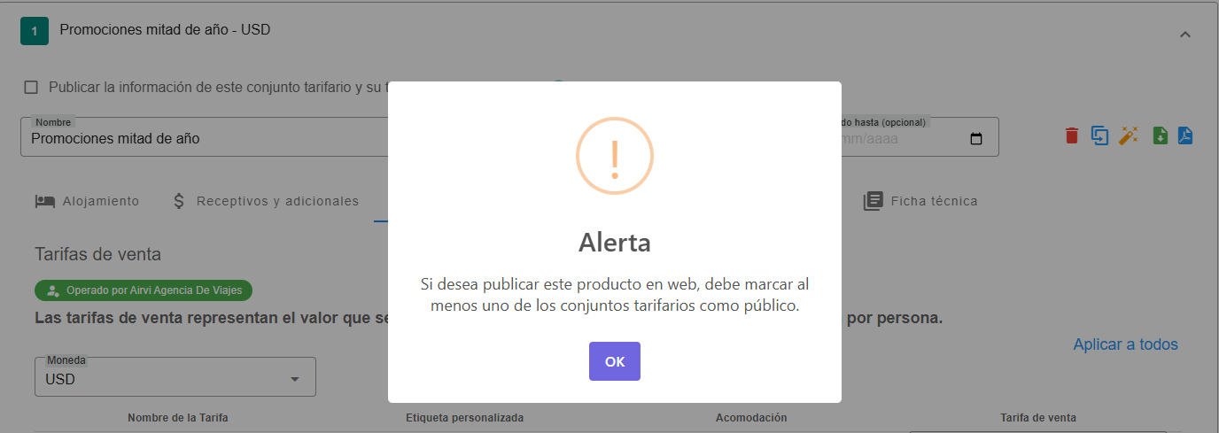 Aparecerá una alerta si no selecciona un conjunto tarifario