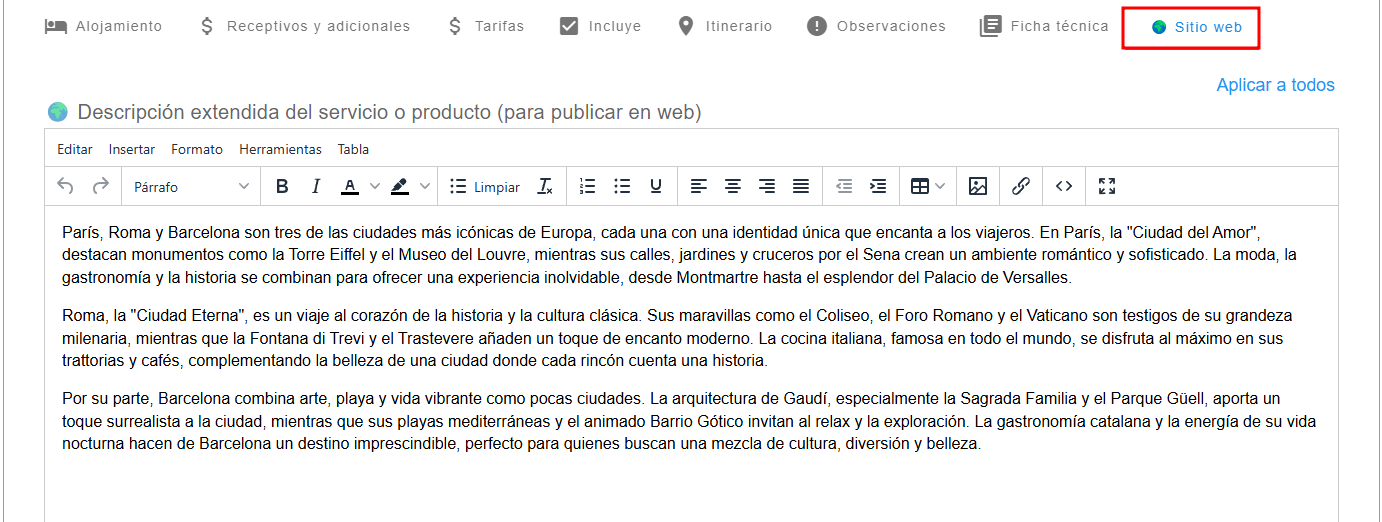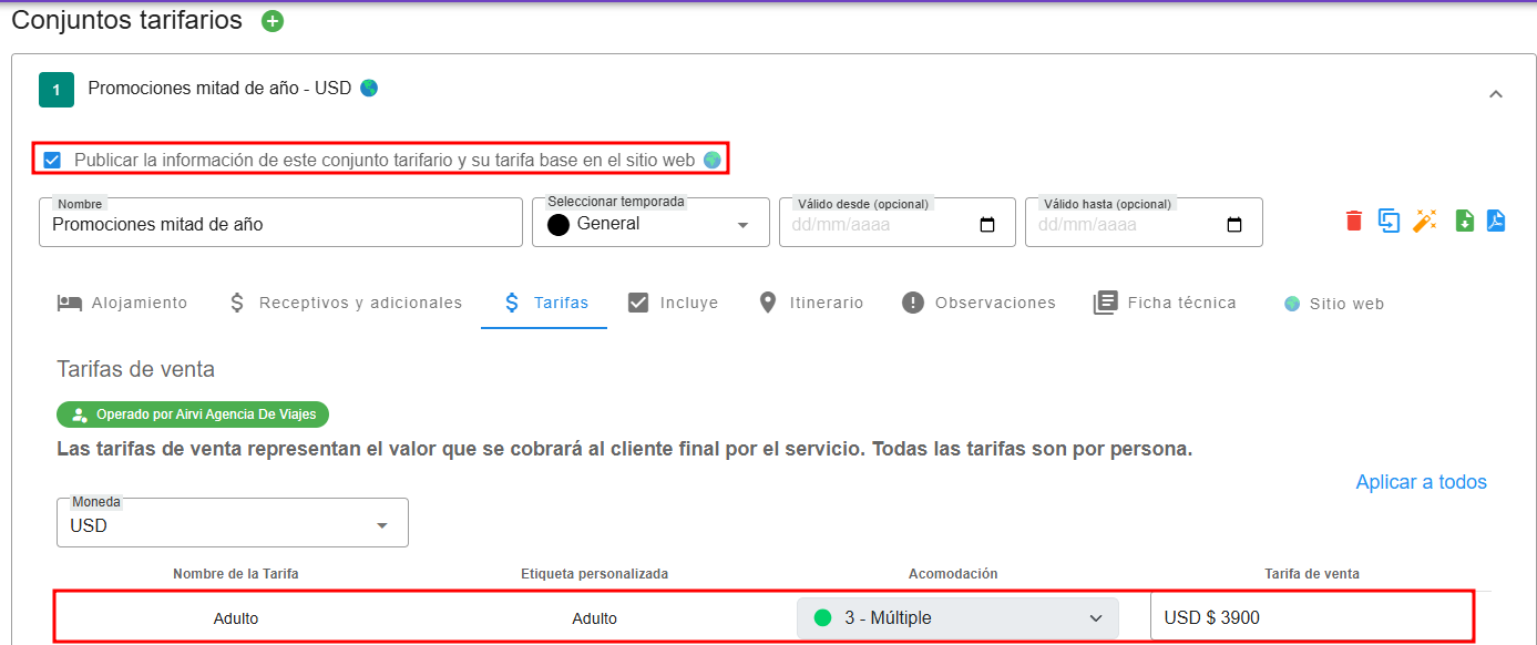 • Después de seleccionar el conjunto tarifario que deseas publicar, aparecerá un módulo adicional llamado "Sitio Web".