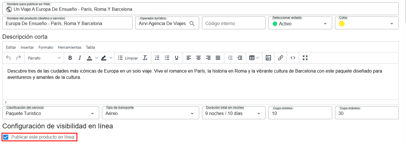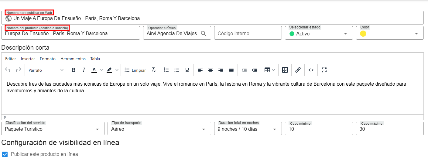 • Al guardar, la información del producto se publicará automáticamente en tu página web. Siguiendo estos pasos, podrás asegurar que tus productos y servicios estén siempre actualizados y visibles para tus clientes en tu sitio web.