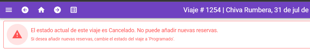 Viaje Cancelado: Si intentas acceder al panel de reservas de un viaje que ha sido cancelado, recibir谩s un mensaje de error indicando que el viaje est谩 cancelado. Esto te informa que no puedes gestionar reservas para ese viaje.