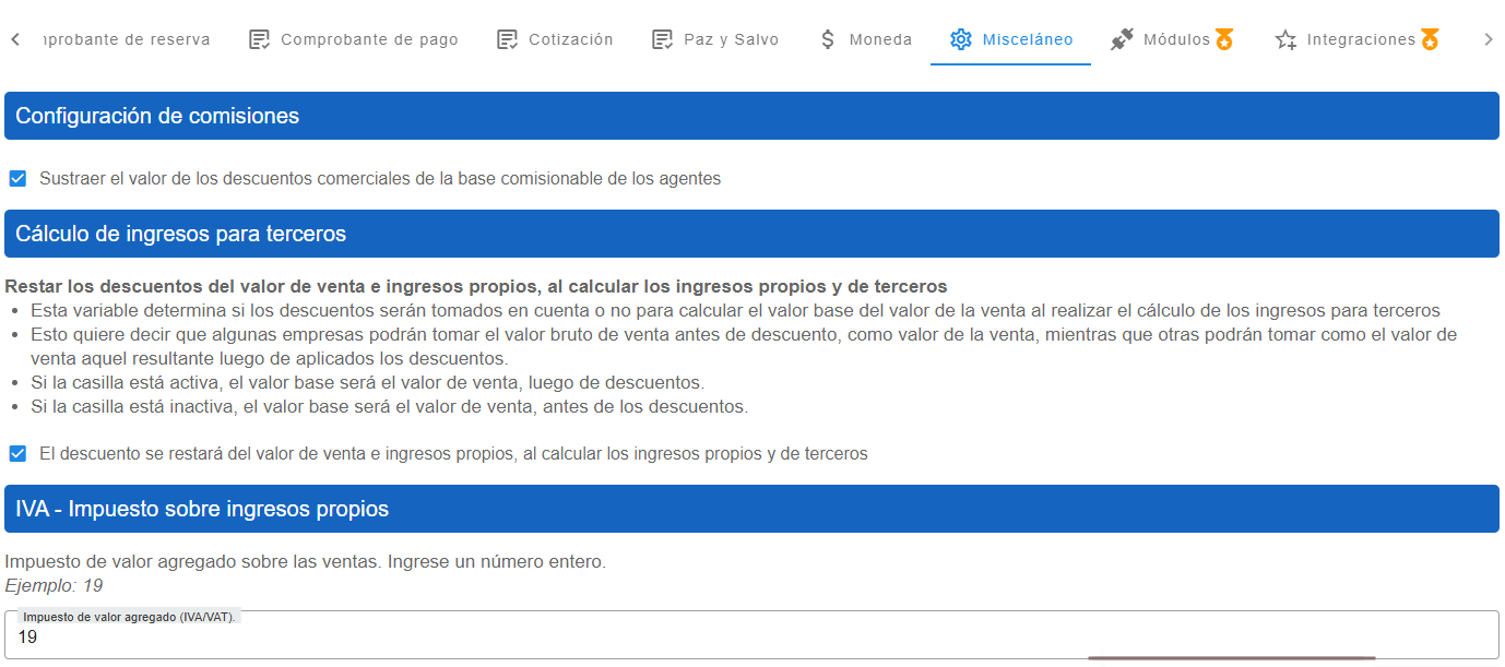 En este módulo se configuran aspectos clave relacionados con el cálculo de comisiones e impuestos. Podrás establecer el porcentaje del IVA aplicable sobre los ingresos propios, ingresando un valor numérico entero (por ejemplo: 19).