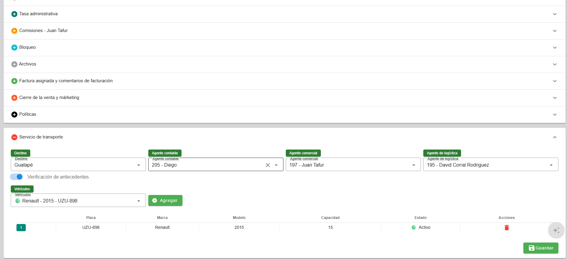 El módulo de Asignación de Transporte permite configurar los aspectos operativos relacionados con la logística de un viaje. Desde esta sección se pueden asignar el destino del servicio, así como los responsables operativos, incluyendo el agente contable, el agente comercial y el agente de logística. También se incluye una herramienta para la verificación de antecedentes de los actores involucrados, y la selección del vehículo a utilizar. Una vez asignado el vehículo, el sistema muestra automáticamente su información principal, como marca, modelo, capacidad y estado operativo, facilitando la validación de los recursos antes de la ejecución del viaje