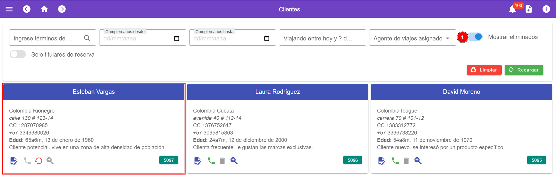 • Visualizar el historial del cliente: Accede a la lista de viajes relacionados mediante la lupa en la card del cliente.